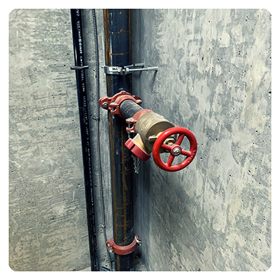 The red thing looks like a fire hydrant – somewhere for the firemen to connect their hoses. It’s probably connected to the main water supply.